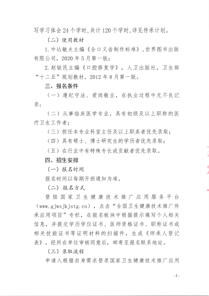 您现在的位置是:首页>新闻资讯 > 通知公告 > 关于口腔生理性全口义齿修复技术师承人招录的函 发布时间:2023-12-04 11:00:00 来源: 附件: 关于口腔生理性全口义齿修复技术师承人招录的函 上一篇:关于蒙医白脉针加服蒙药对痛症、肾病、抑郁症的治疗技术师承人招录的函 下一篇:关于口腔种植修复技术师承人招录的函 相关文章